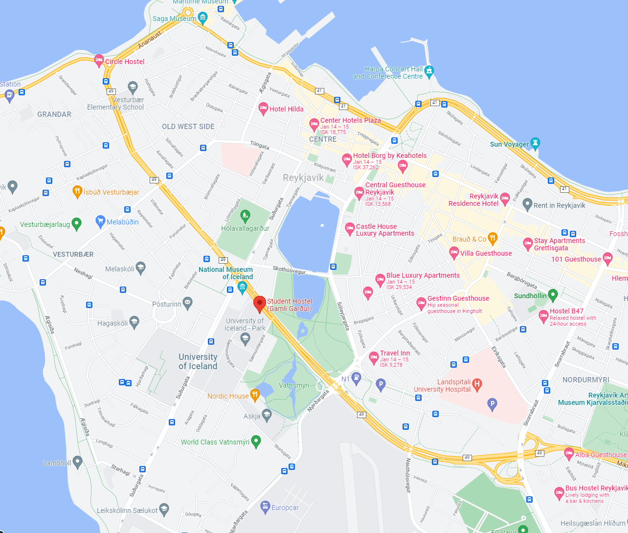 Student hostel is on campus at the University of Iceland, with various service such as the University Bookstore, Bookstore Café, Háma (canteen) and the Student Cellar (bar).